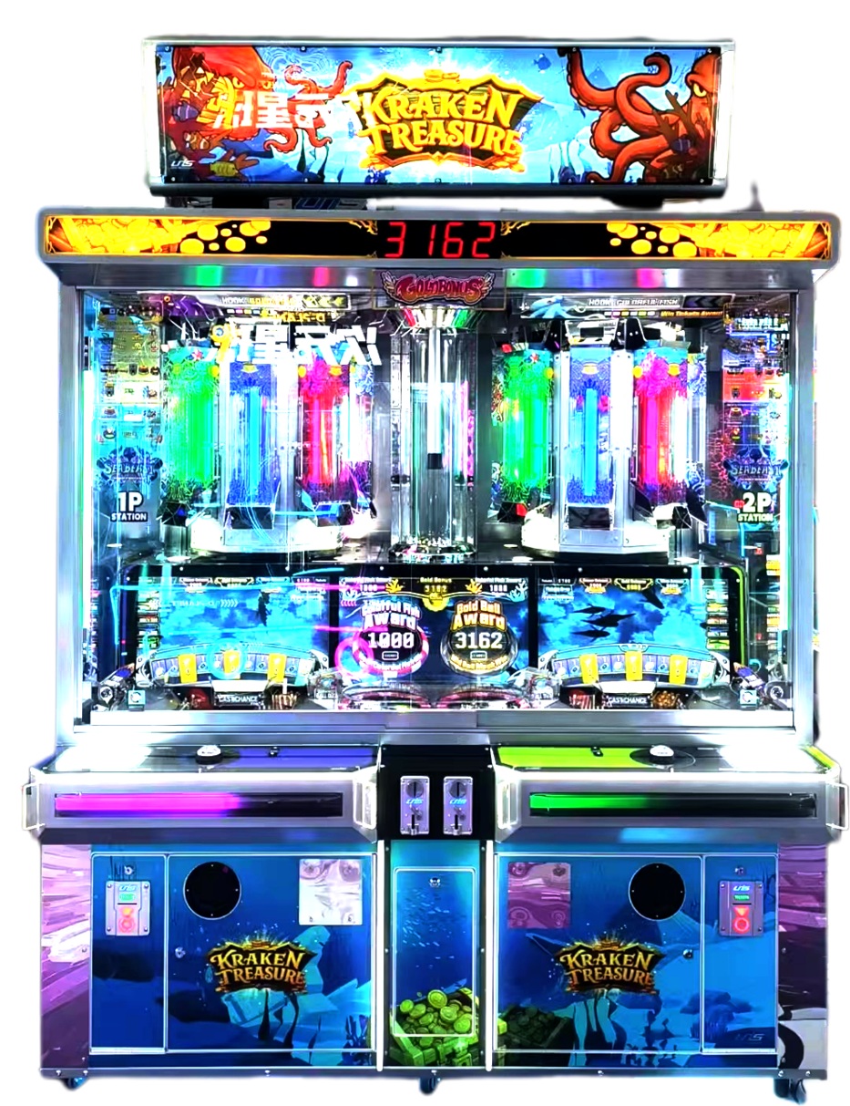 • 2-player coin-shooting arcade game with colorful fish-catching gameplay